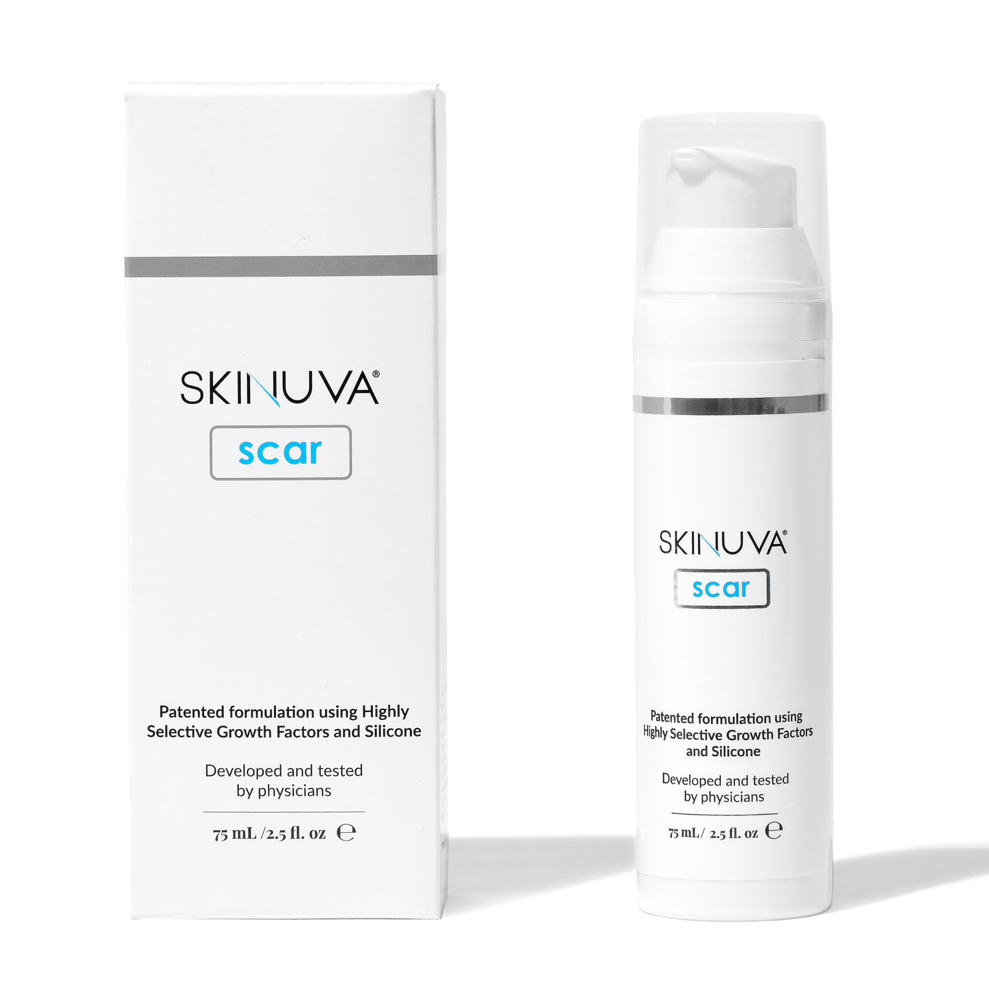Skinuva Scar is a physician designed and clinically tested scar cream that uses highly selective growth factors within a silicone cream matrix to help improve the appearance of scars. Skinuva's rigorous clinical studies have shown that Skinuva Scar improves the appearance of scars nearly two-times better when compared to silicone cream.